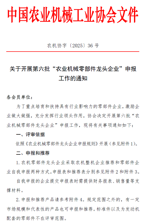 关于开展第六批“农业机械零部件龙头企业”申报工作的通知