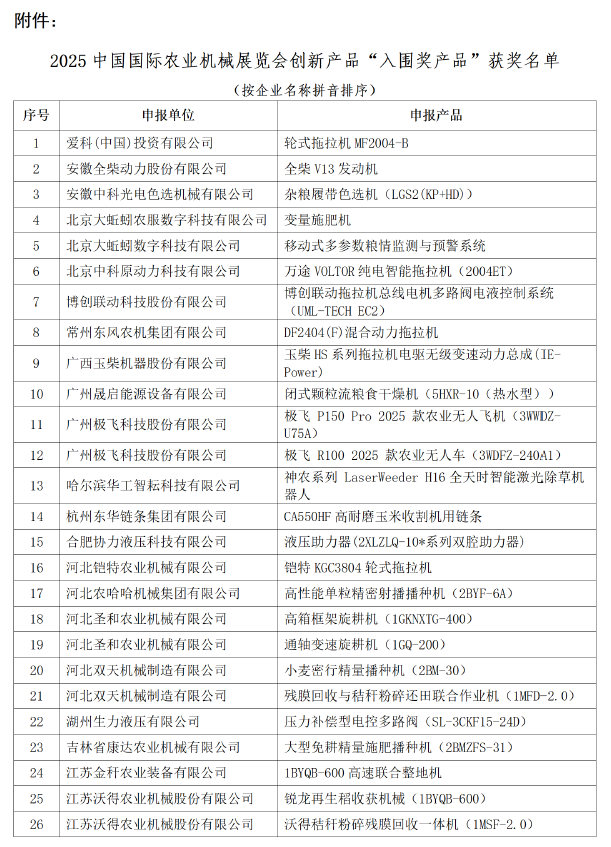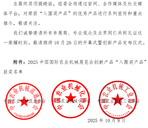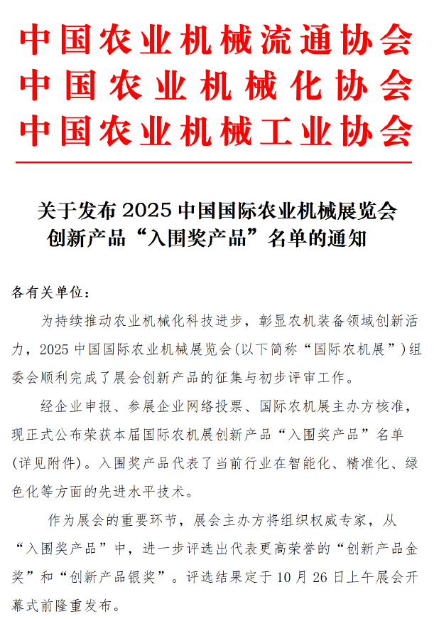关于发布2025中国国际农业机械展览会创新产品“入围奖产品”名单的通知