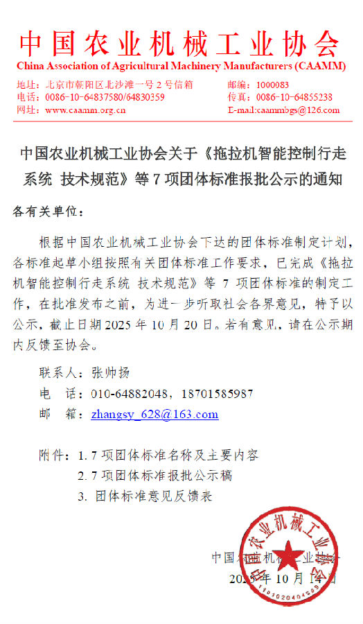 中国农业机械工业协会关于《拖拉机智能控制行走系统 技术规范》等7项团体标准报批公示的通知