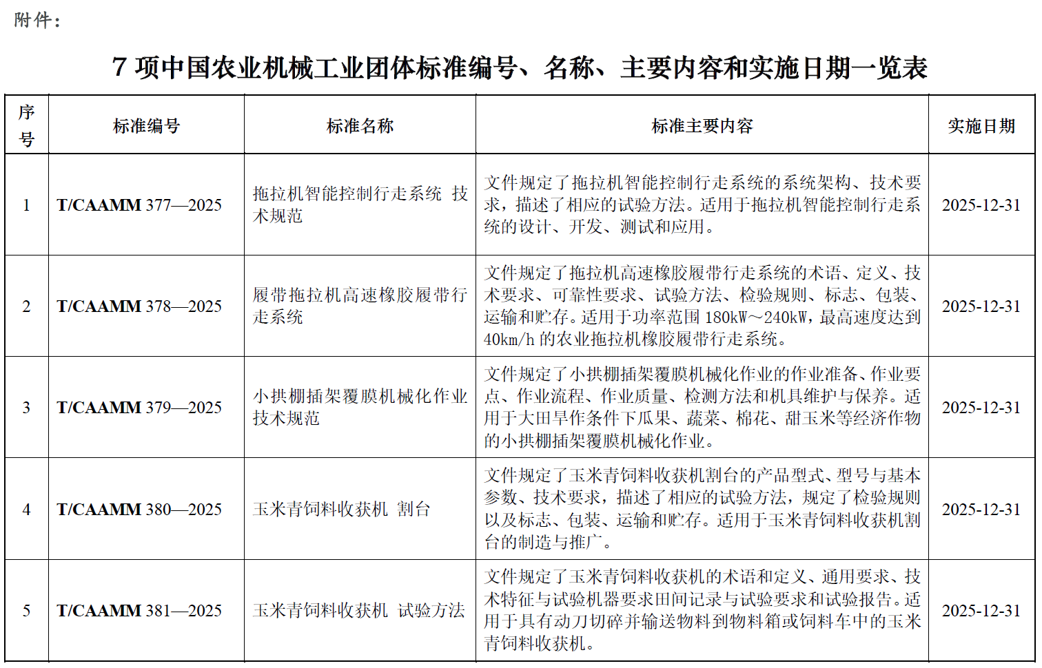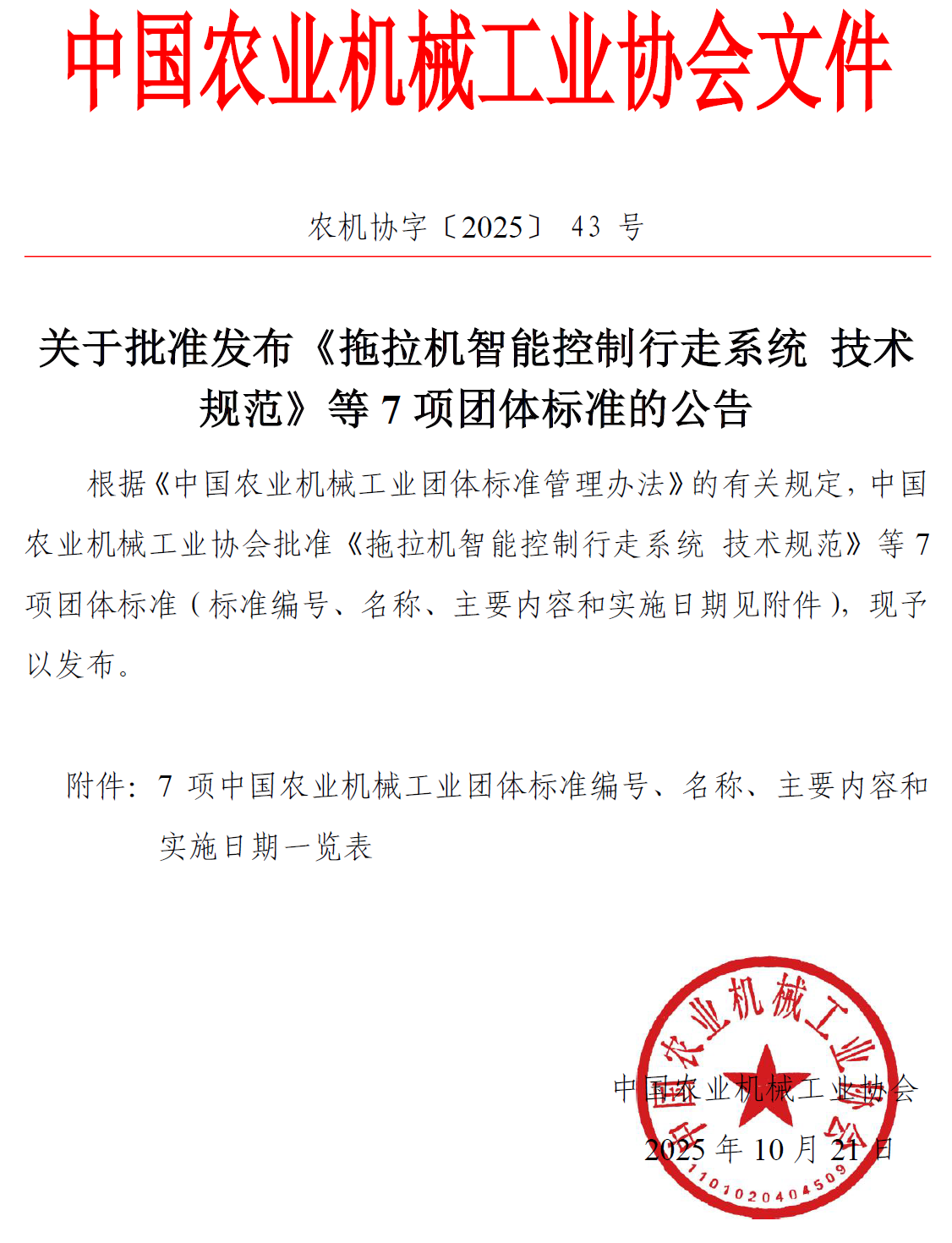 关于批准发布《拖拉机智能控制行走系统 技术规范》等7项团体标准的公告
