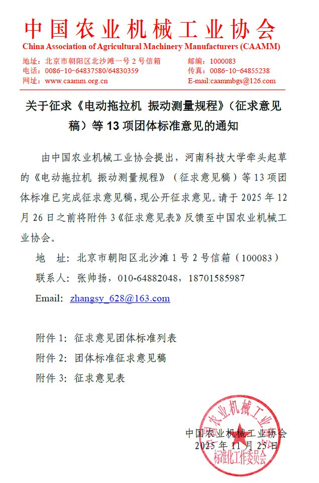 关于征求《电动拖拉机 振动测量规程》(征求意见稿)等13项团体标准意见的通知