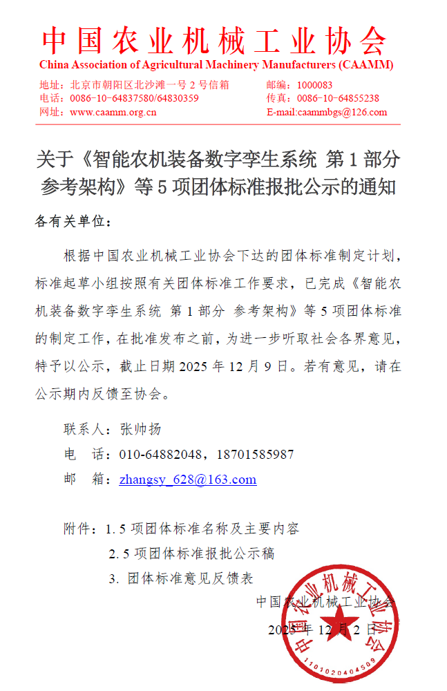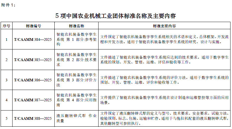 关于《智能农机装备数字孪生系统 第1部分 参考架构》等5项团体标准报批公示的通知